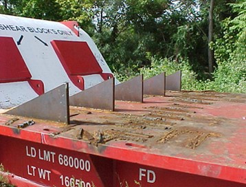 The above photos show examples of proper use of the steel deck surface for welding securements and tie-downs for various loads. Photo 1 shows the shear block pads, along with end-stops and tie-down brackets in the transition area of an 8-axle depressed car. Photo 2 shows the weldable area of the transition area, as well as fabricated end-stops that have been welded to the deck. Photo 3 shows an example of tie-down securement to the shear block pads on an 8-axle FD.